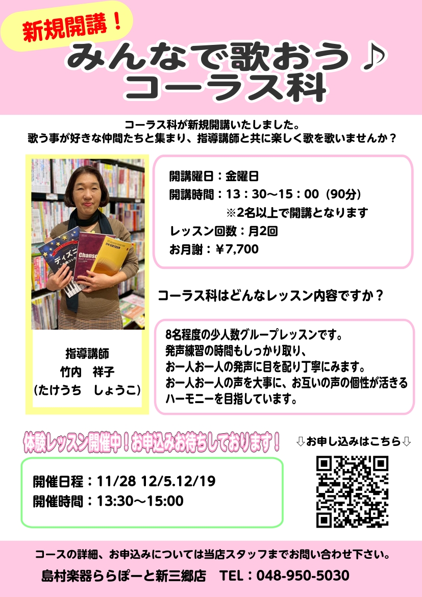 어떤 장소에서도, 악기가 없어도, 자신의 몸과 동료만 있으면 음악을 낳을 수 있는, 그것이 코러스입니다. 자신의 목소리가 수많은 선율과 겹쳐서 아름다운 하모니를 쫓아가는 묘미를 체감해 보지 않겠습니까. 동요부터 팝까지, 동료와 함께 즐겁게 노래합시다!