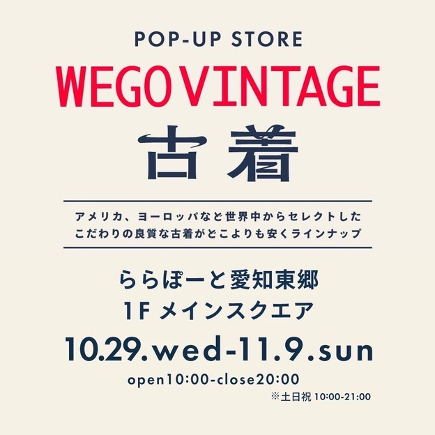 WEGO (WEGO)는, 도쿄·하라주쿠의 스트리트로부터 발신되는 스타일을 메인으로, 폭넓은 테이스트를 망라하는 오리지날, 한층 더 개성적인 유즈드를 MIX해, WEGO 류의 어레인지로 최신의 트렌드를 제안합니다.패션에 강하게 흥미를 가지기 시작하는, 20대 전후의 대학·전문 학생을 타겟 이미지로서, 그들이 생각하는 세련된 감의 “반보처”, 그들이 생각하는 데일리 유스인 “리얼 클로즈”를 추구하고 있습니다.