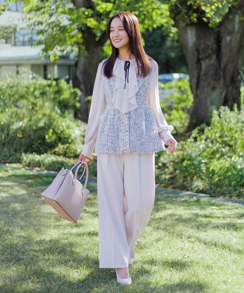 여러 종류의 실을 섞은 입체감이 있는 트위드에 섬세한 튤을 거듭한 특별감이 있는 소재입니다.