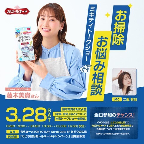 세탁조 클리너 「카비토르네이드」앰배서더의 후지모토 미키씨를 맞이해, 「가사・육아」등에 대해 진심으로 말하는 토크 쇼를 개최! MC에는 2병 유카씨가 등장합니다.