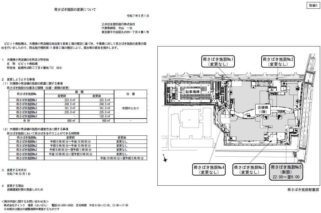 【LaLaport TOKYO-BAY North Gate(구비 vivit MINAMI FUNABASHI)】 대규모 소매점포 입지법 변경의 알림 대규모 소매점포 입지법 제6조 제2항의 규정에 근거해 당해 점포의 신고 내용에 대해서, 짐장소의 추가 변경이 지바현에서 인정되었으므로, 알려 드리겠습니다.