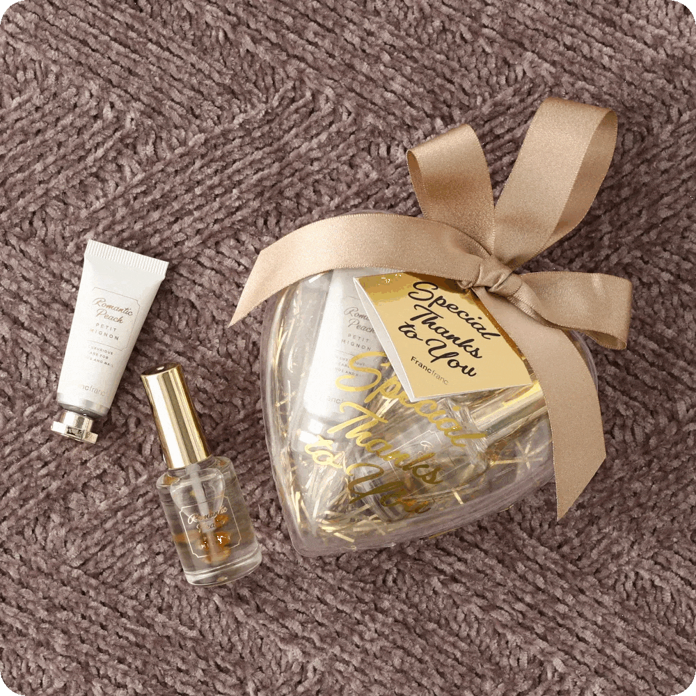 「하트형의 오너먼트풍에 랩핑 된 네일 오일과 핸드 크림의 선물 세트는, 사용하기 전에 우선 방에 장식하고 싶어지는 럭셔리감 있는 일품.