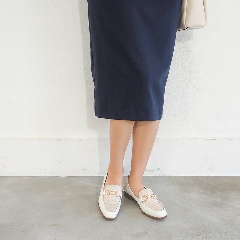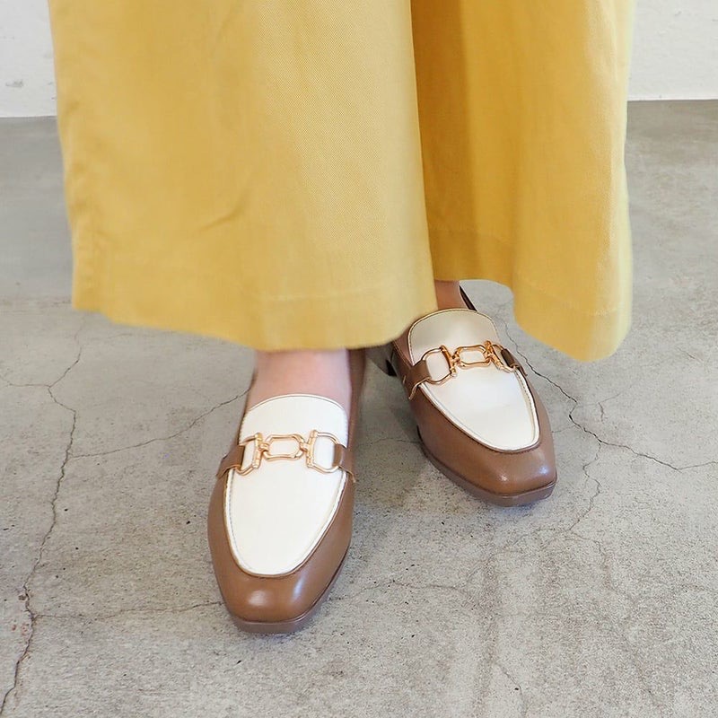 화이트를 능숙하게 적용한 깨끗한 배색에, 골드의 비트 오너먼트가 화려한 악센트를 플러스. 캐주얼한 모카 디자인이면서, 단정하고 세련된 외모로 완성하고 있기 때문에, 어른의 예쁜 스타일링에도 훌륭하게 조화합니다.