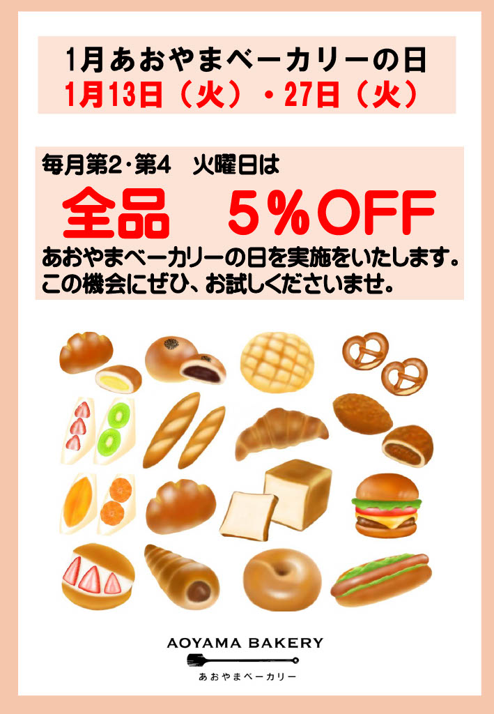 - あおやまベーカリーの日!パン全品5%OFF!