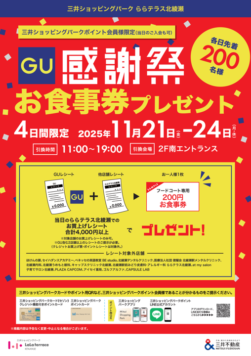 라라 테라스 키타 아야세 3층 GU +타 대상 점포에 있어서 합계 4,000엔(세금 포함) 이상의 당일 매입 영수증과 미쓰이 쇼핑 파크 포인트 회원이라고 아는 것을 제시해 주신 분에게 라라 테라스 기타 아야세 푸드 코트 점포 전용 식사권 200엔분을