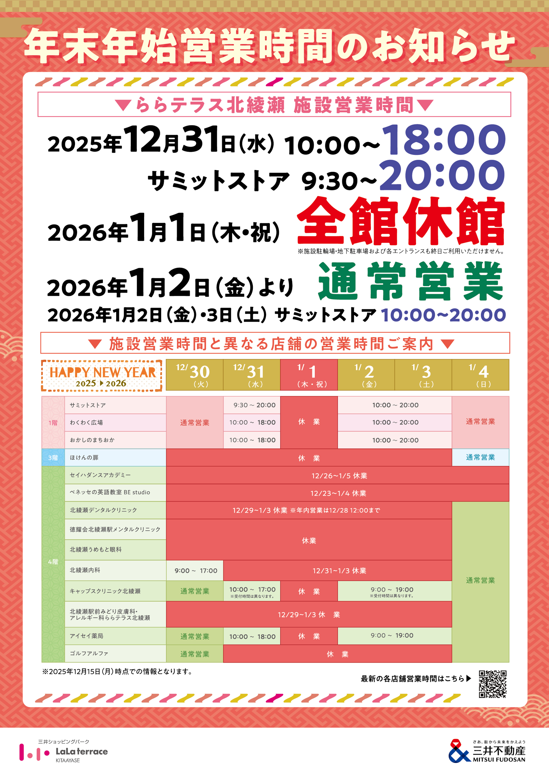 ※연말연시의 기간중, 일부 휴업이 되는 점포나 영업 시간 다른 점포가 있습니다. 자세한 내용은 각 점포에 Contact 하십시오.