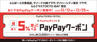 12/12(금)~12/25(목)의 기간, 사전에 PayPay 내에서 쿠폰을 취득해, 대상 점포에서 PayPay를 이용한 후 지불해 주시면 최대 5%분의 PayPay 포인트가 후일 부여됩니다.
