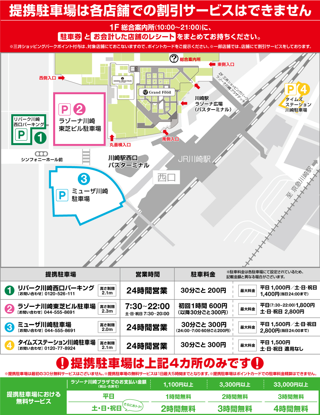 - ※ LAZONA Kawasaki Plaza (부지내)의 주차 요금 체계와 서비스 방법이 다르므로 주의해 주십시오.
