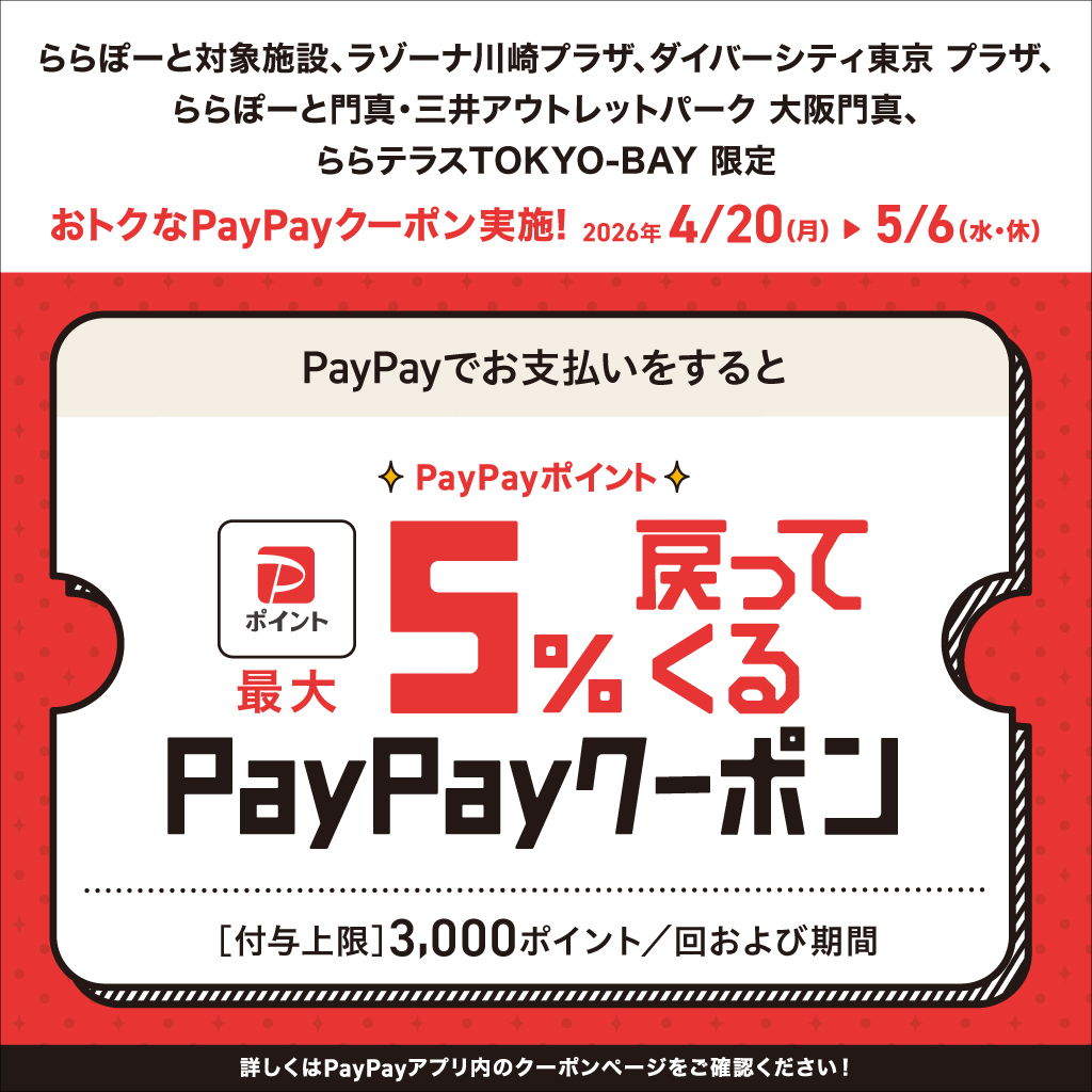 4/20(월)~5/6(수·축)의 기간, LAZONA Kawasaki Plaza 에서는 PayPay의 지불로 PayPay 포인트 최대 5% 돌아오는 유익한 쿠폰을 실시합니다!