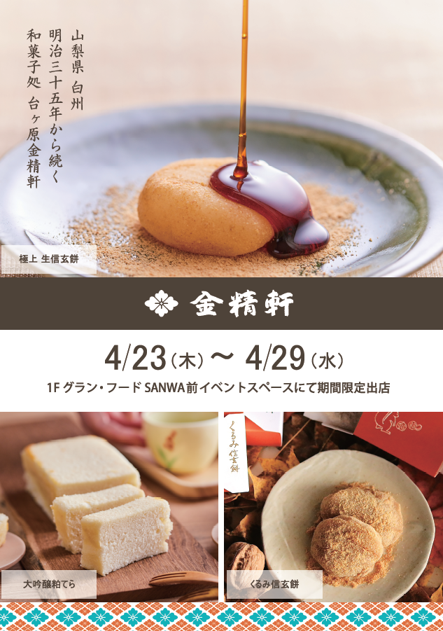 - 【4/23(목)~4/29(수)】김정처가 1 F그란·푸드 산와마에 이벤트 스페이스에 기간 한정 출점!