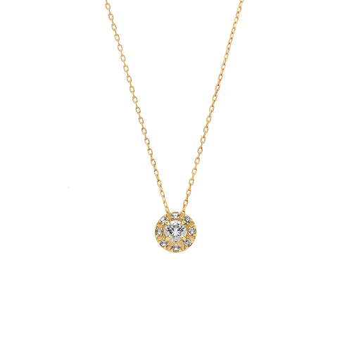 굵은 센터 스톤과 둘러싸는 섬세한 스톤의 빛이 서로 울려 퍼져, 가슴에 우아한 반짝임이 퍼집니다.