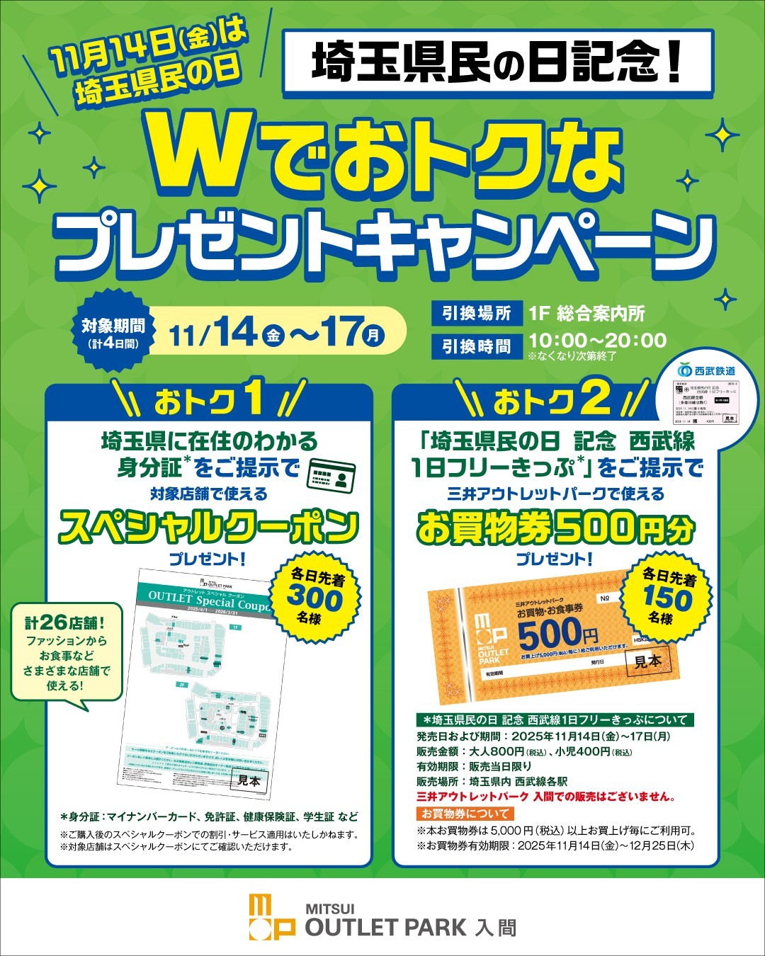 사이타마 현민의 날 기념 세이부선 1일 프리 티켓을 제시로, MITSUI OUTLET PARK에서 사용할 수 있는 쇼핑권 500엔분을 선물!