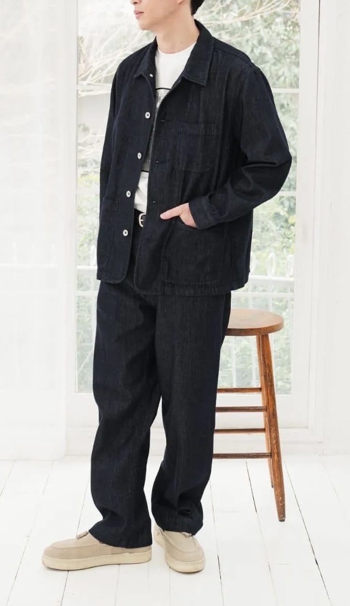 코튼×폴리에스텔×재생 섬유(셀룰로오스)를 블렌드한 소재를 사용. 인디고 염색이 아닌 반응 염료로 염색하는 것으로, 탈색을 억제하면서 코튼 본래의 감촉을 오랫동안 즐길 수 있습니다. 가볍고 편안한 착용감도 매력입니다.