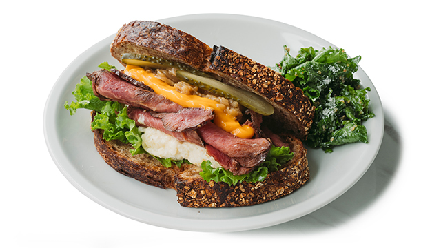 캐러멜 양파에는 꿀, 감자 샐러드에는 호스 래디쉬와 블랙 페퍼를 얹어 치즈 감칠맛, 케일의 쓴맛, 피클의 새콤달콤함을 균형있게 겹쳤습니다.
