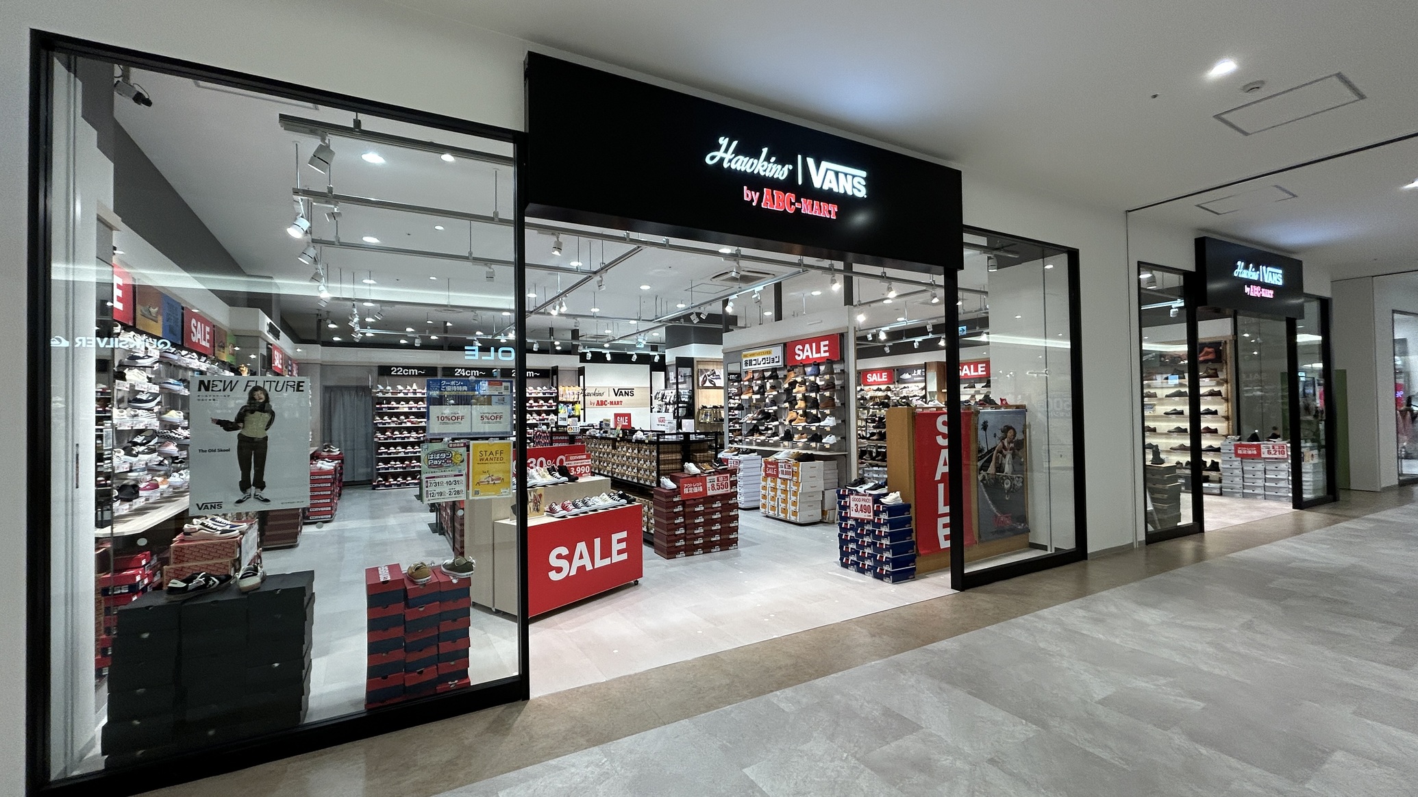 캐주얼 스타일을 베이스로 트렌드 에센스를 플러스한 「HAWKINS」와 액션 스포츠의 슈즈 브랜드인 「VANS」가 병설.ABC ABC-MART가 프로듀스하는 슈즈 매장 한 번에 즐길 수 Kids 가게입니다.
