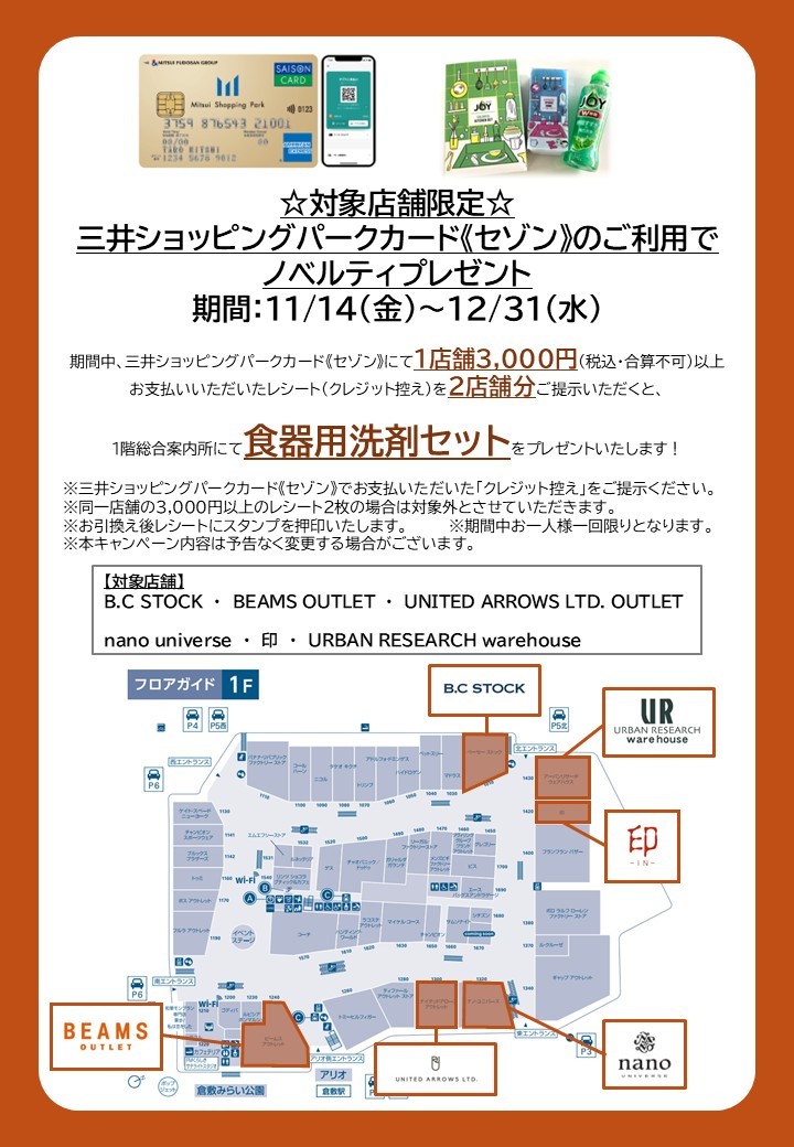대상 점포: B.C STOCK /BEAMS OUTLET /UNITED ARROWS LTD. OUTLET /NANO UNIVERSE /표식 / 표시URBAN RESEARCH warehouse