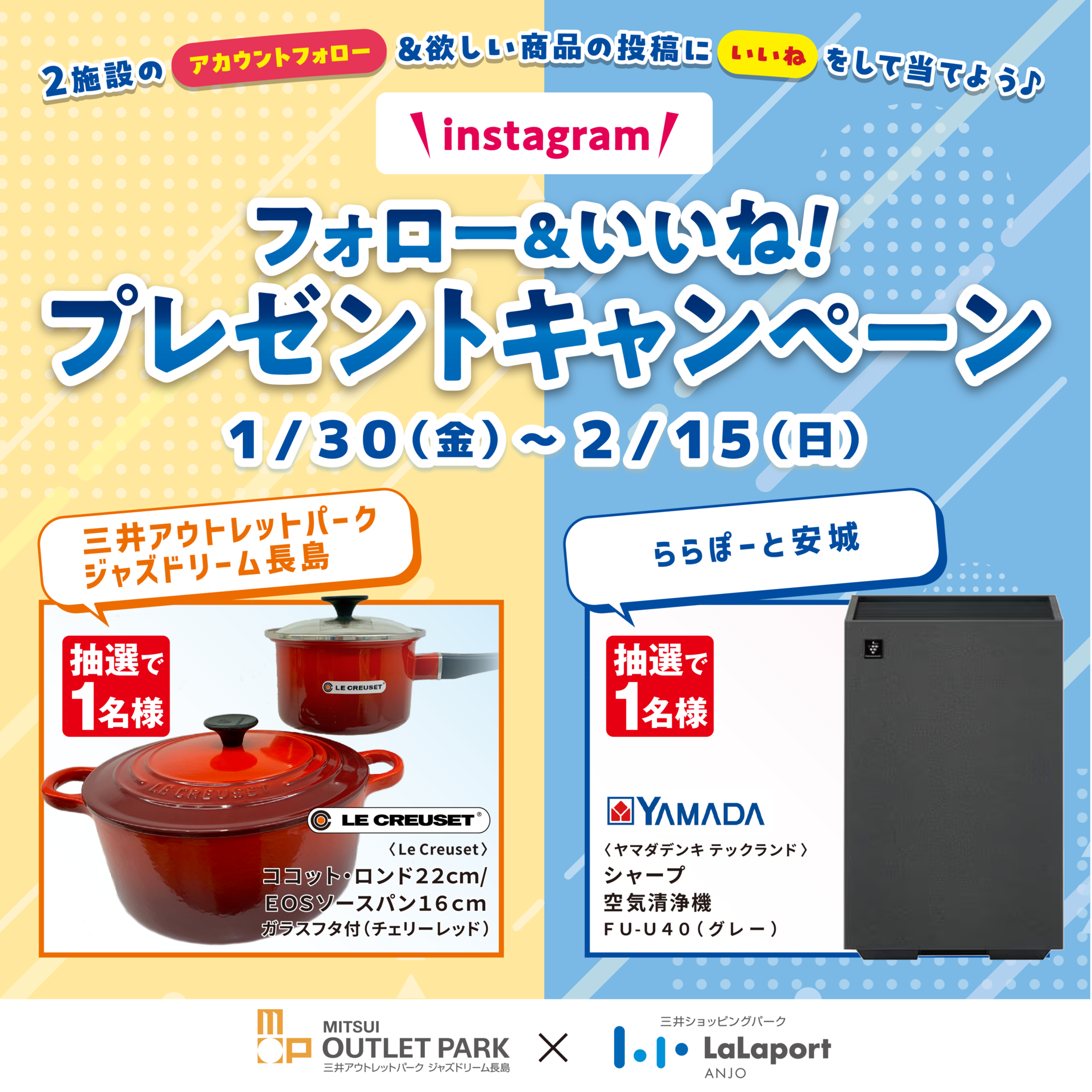 1/30(금)~2/15(일)의 기간중,【MITSUI OUTLET PARK JAZZ DREAM NAGASHIMA ×미쓰이 쇼핑 파크 LaLaport ANJO】팔로우&좋아! 에 해당하는 선물 캠페인을 개최합니다! !