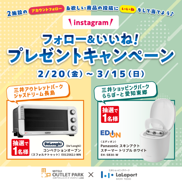 2/20(金)~3/15(日)の期間中、【三井アウトレットパーク ジャズドリーム長島×三井ショッピングパーク ららぽーと愛知東郷】フォロー&いいね!で当たるプレゼントキャンペーンを開催いたします!!