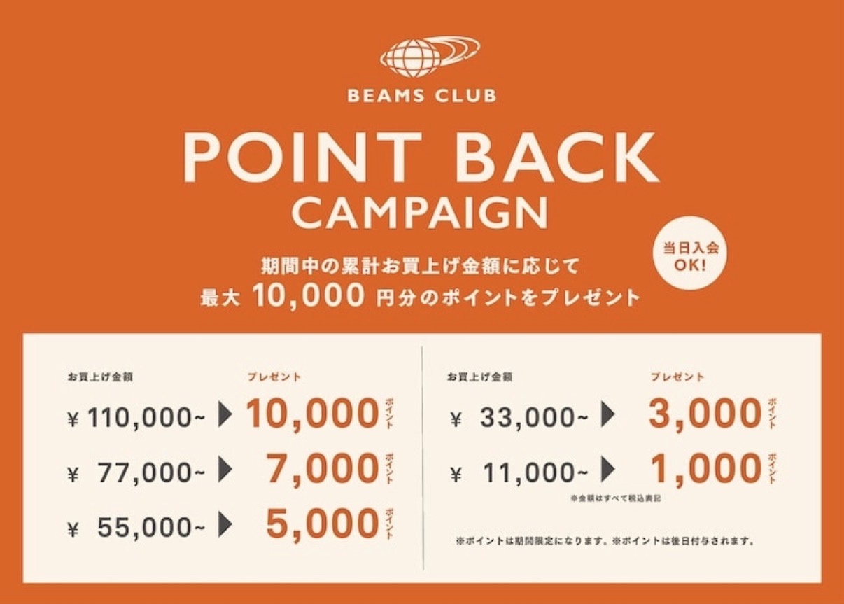BEAMS CLUB 회원 한정 「포인트 백 캠페인」개최! 최대 10,000엔분의 포인트를 선물!