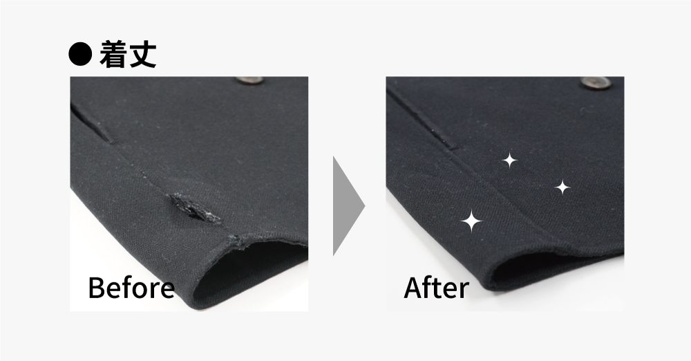 ●소매 길이 ●옷길이 ●품 ●어깨 폭 ●어깨 패드 ●소맷부리・옷길이의 긁힘 ●패스너 교환 ●안감 교환 ●낚아채・찢어 보수(걸어 잇기/걸어 박기) ●버튼 부착・교환 등