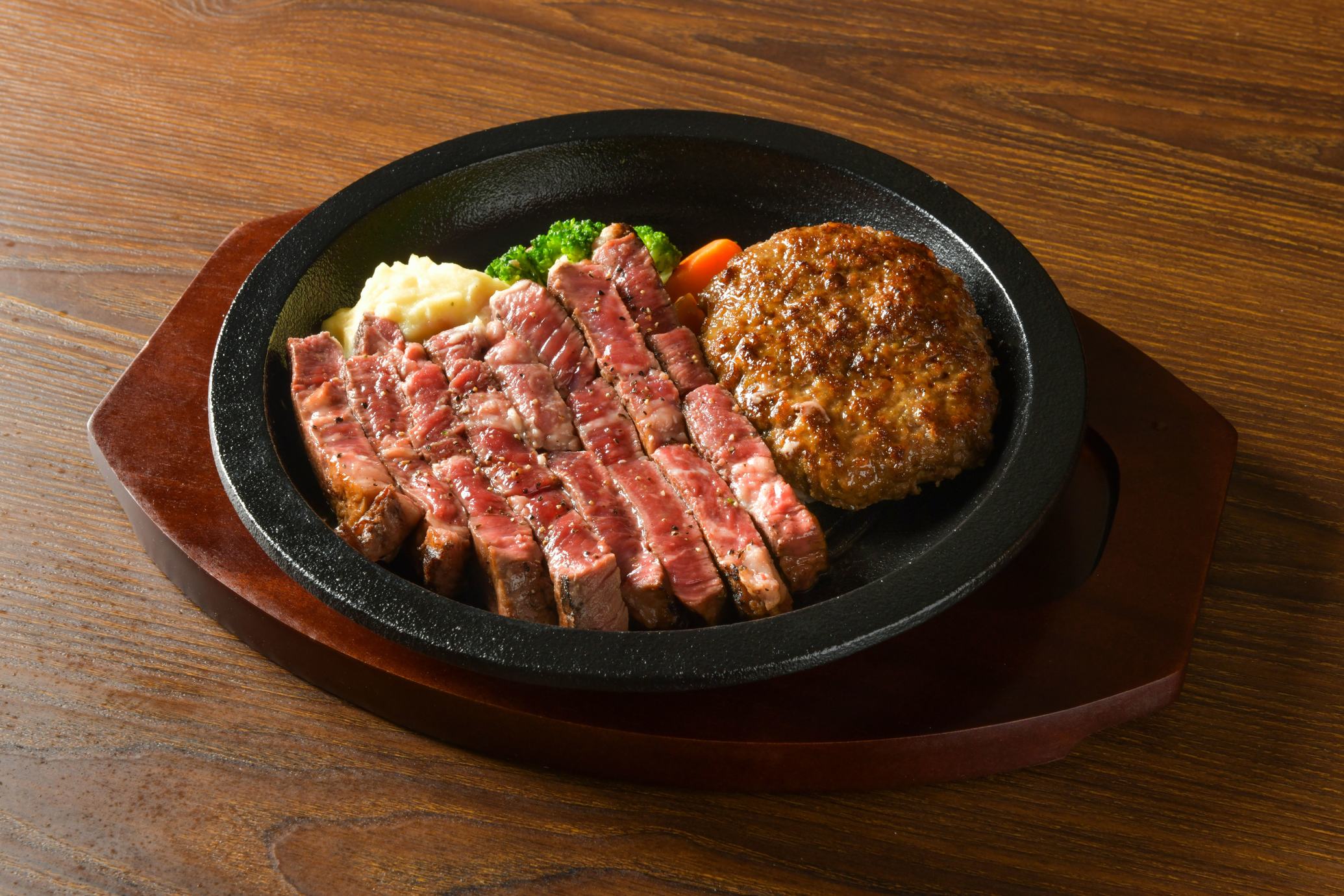 석가마로 굽기 때문에 고기의 맛을 듬뿍, 여기서 밖에 맛볼 수없는 궁극의 햄버거와 엄선한 조건 소의 스테이크 전문점.