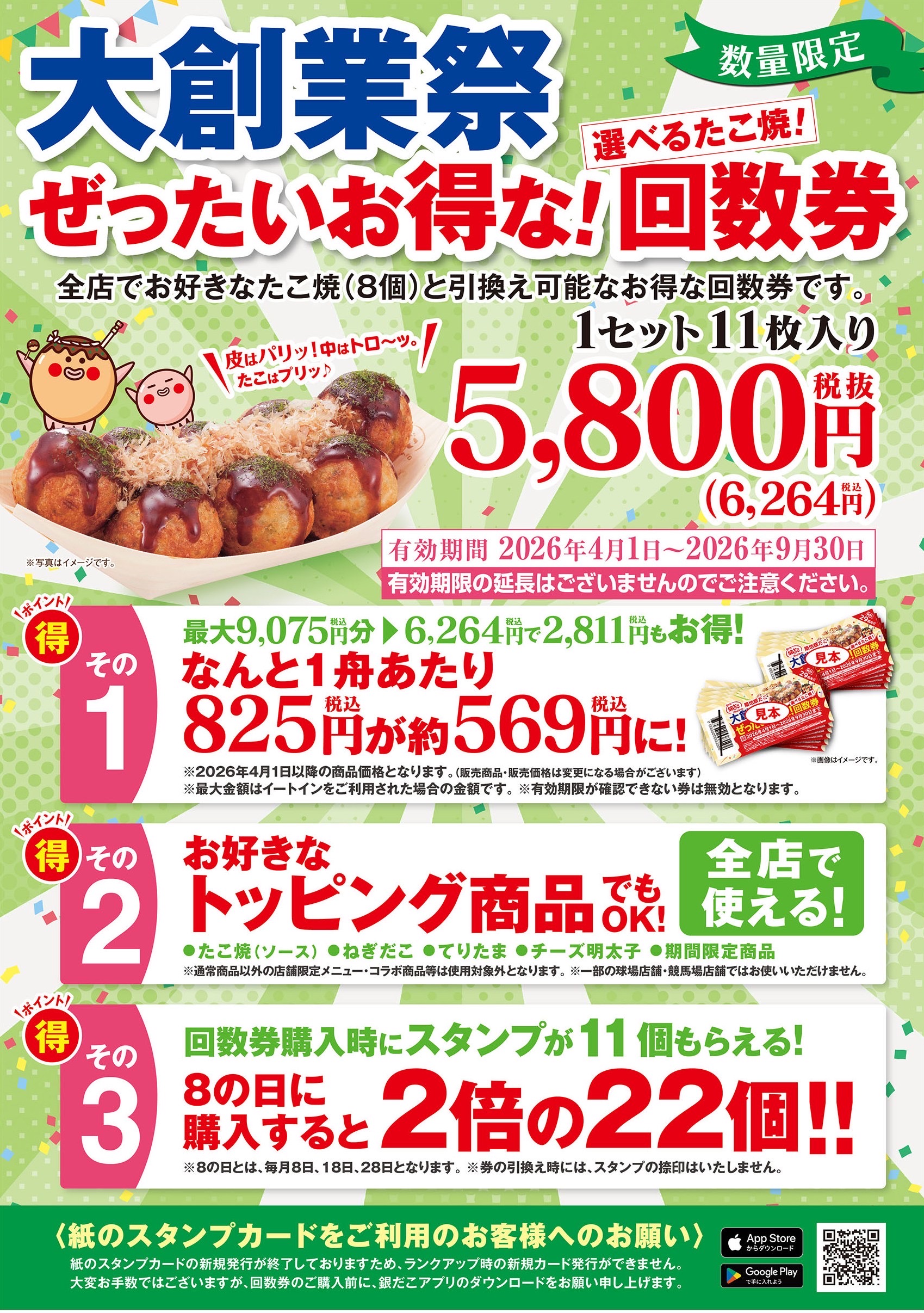 또 구입시에는, 스탬프가 모이면 타코야키가 무료로 받을 수 있는 “GINDACO 스탬프 카드 ”의 스탬프를, 회수권의 매수분 선물! 통상 8일, 18일, 28일의 “8이 붙는 날”에 구입해 주시면, 스탬프가 2배 (*3)가 됩니다만, 이번은 Tsukiji GINDAKO “대창업제”의 개최중에 대해,3월 7일(토)는 스탬프 2배! , 3월 8일(일)과 3월 14일(토)는, 무려! 스탬프 3배! (3배의 날에 구입하면, 당회수권 4장 세트는 통상 4개가 → 12개에! 11장 세트는 통상 11개가 → 33개에!!
