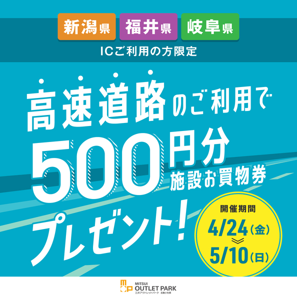 니가타현, 후쿠이현, 기후현의 인터체인지를 이용한 후, 시설에 관람하시면 MITSUI OUTLET PARK 쇼핑・식당권 500엔분을 선물