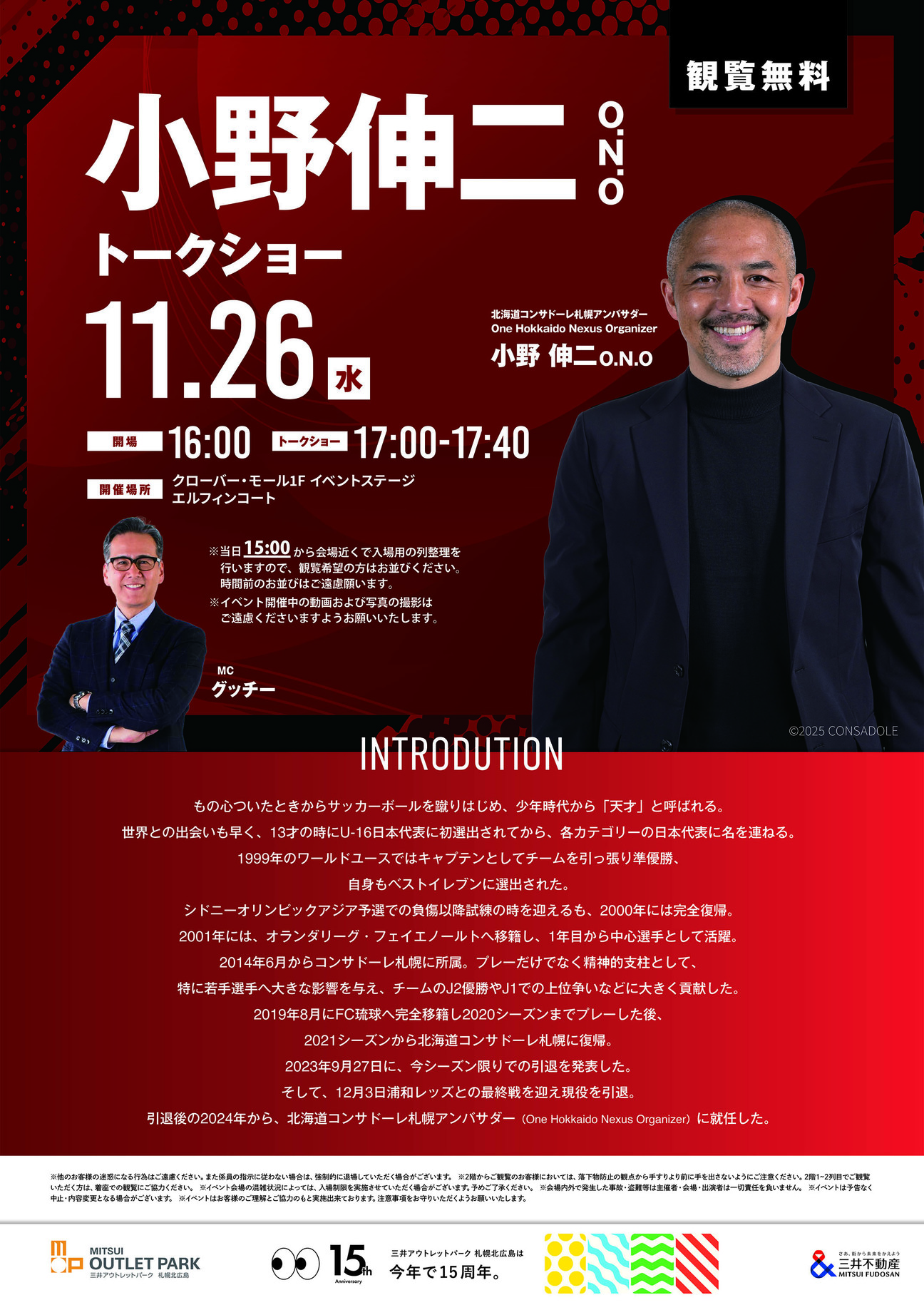 현재는 홋카이도 콘사도레 삿포로 앰배서더(One Hokkaido Nexus Organizer)에 취임하고 있는 오노 신지 ONO의 토크쇼를 개최합니다.