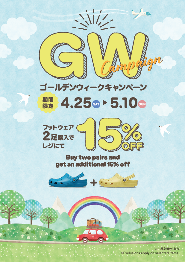 상단뉴스매장 뉴스GW 캠페인 GW 캠페인 4월 25일(토)~5월 10일(일) 신발 & 가방 2F crocs 신발 2 다리 이상 구입으로 더욱 15 % OFF!골든 위크 캠페인 개최!신발 2 다리 이상 구입으로 가격 인하 가격에서 추가 15 % OFF. 사이즈가 없어지기 전에, 서둘러 내점 기다리고 있습니다!*예고 없이 캠페인 내용의 변경도 있습니다. 신발 & 가방 2F crocscrocs 電話番号 022-388-6757 営業時間 10:00~20:00 아이콘 설명 보기 아이콘 설명 보기