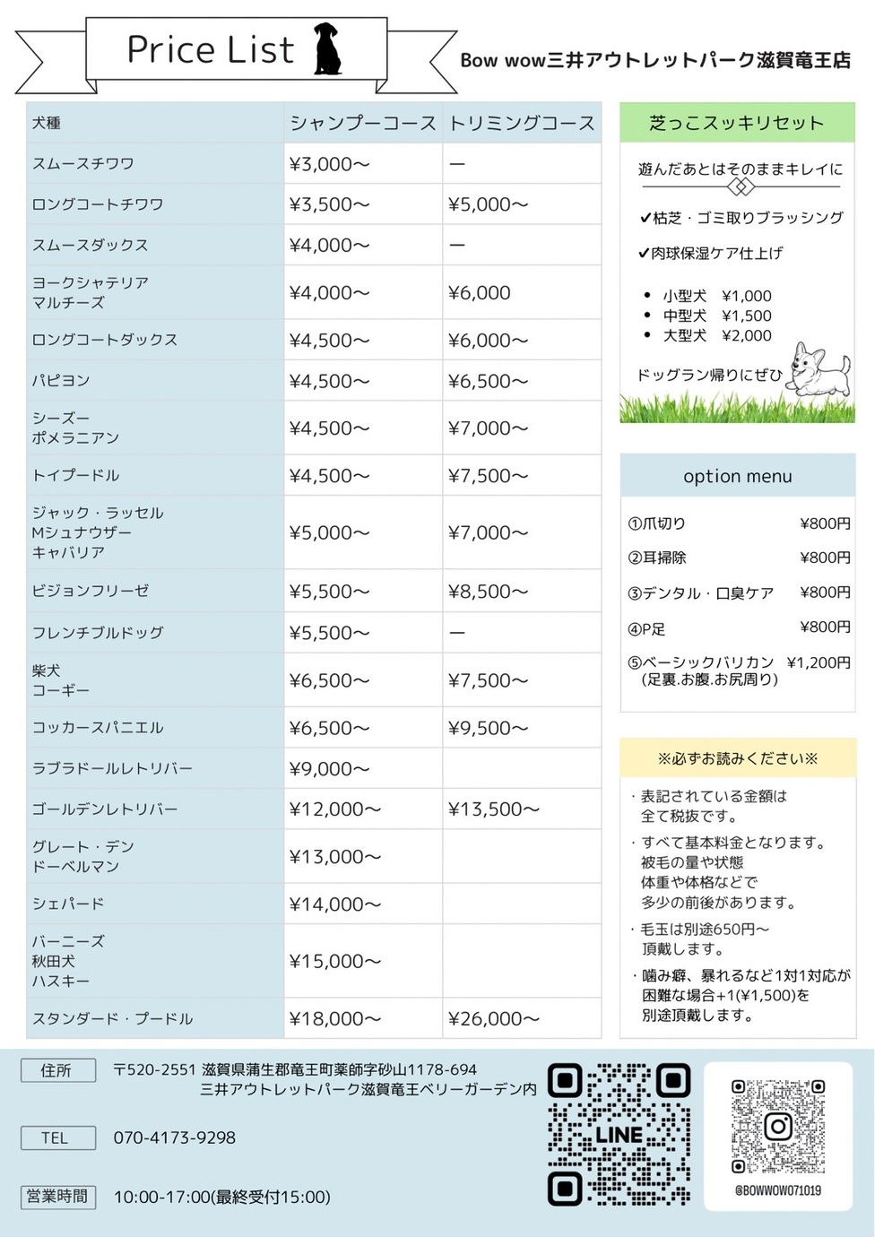 ※샴푸·트리밍은 강아지의 견종이나 사이즈에 따라서 다릅니다.