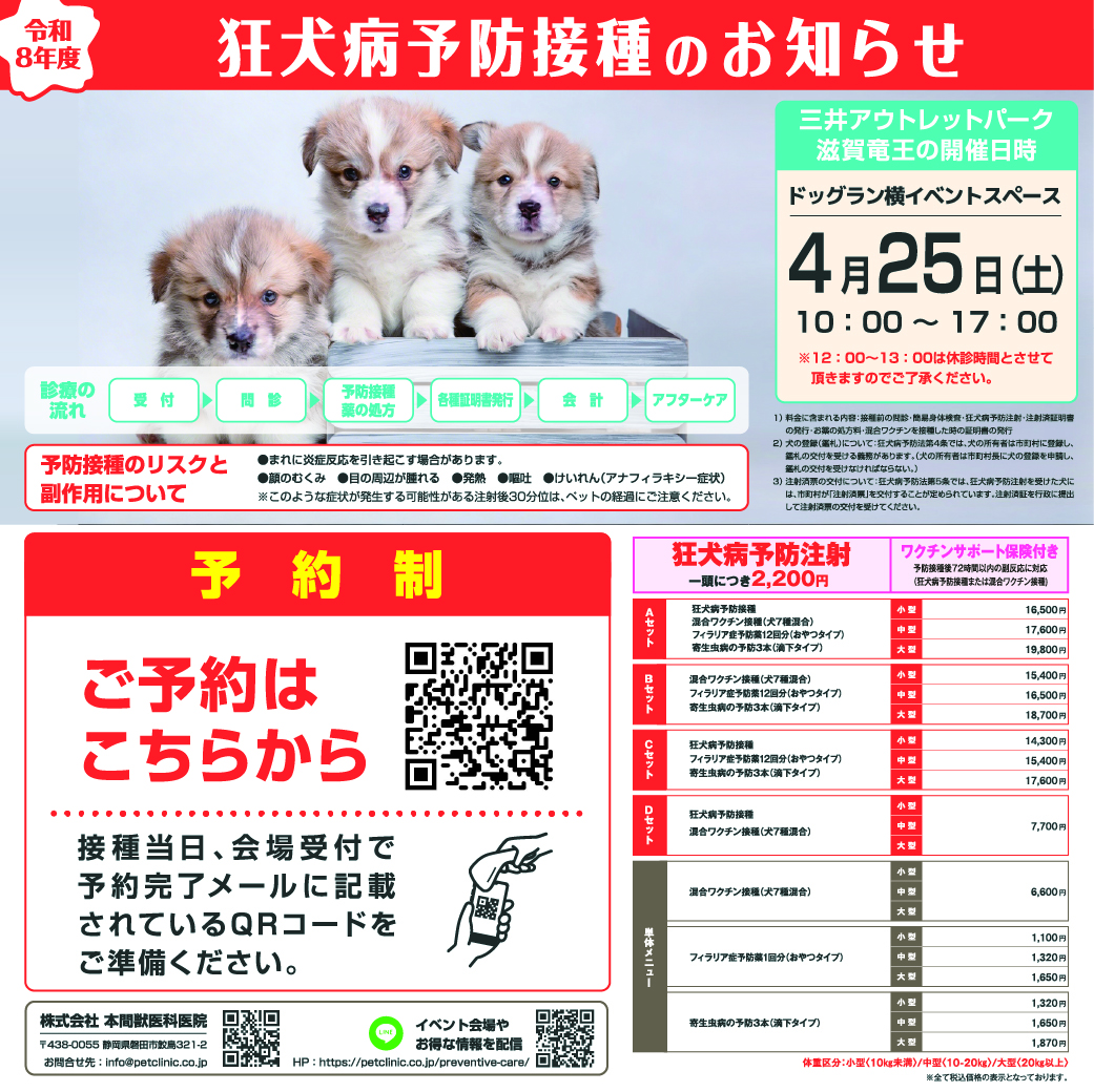 미쓰이 아울렛 SHIGA RYUO 에서는 4/25(토) 10:00~17:00에 도크 런에서 광견병 예방 접종을 개최하겠습니다!