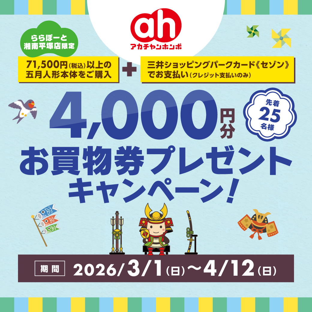 2026/1/1(元日)~2/28()의 기간,akachan honpo LaLaport EXPOCITY 점에서히나 인형 등 대상 상품을1회계70,000(부가세 포함)이상 구입하신 분에게, 쇼핑권3,000엔분을 선물!