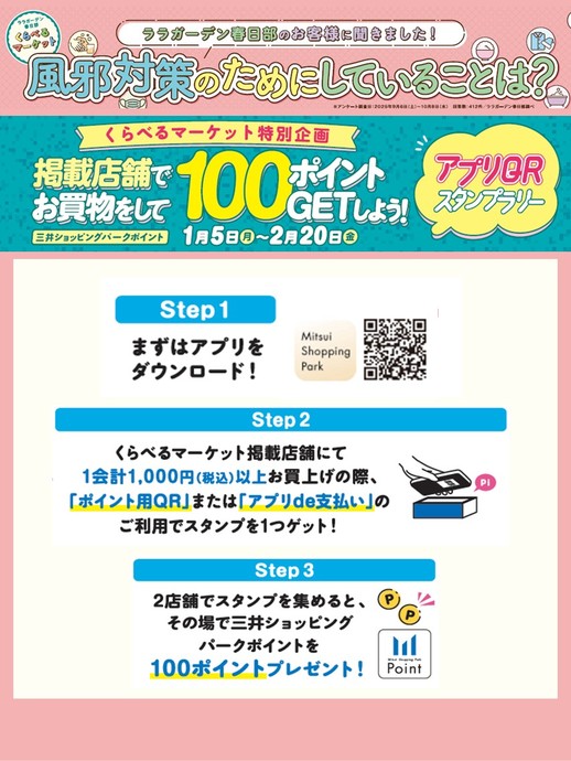 くらべるマーケット「風邪対策のためにしていること」 アプリQRスタンプラリー♪