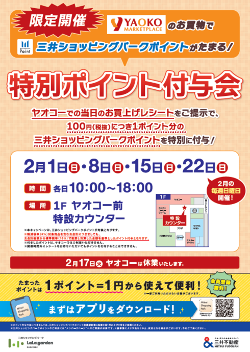 【当日のヤオコーレシート対象】三井ショッピングパークポイント 特別ポイント付与会
