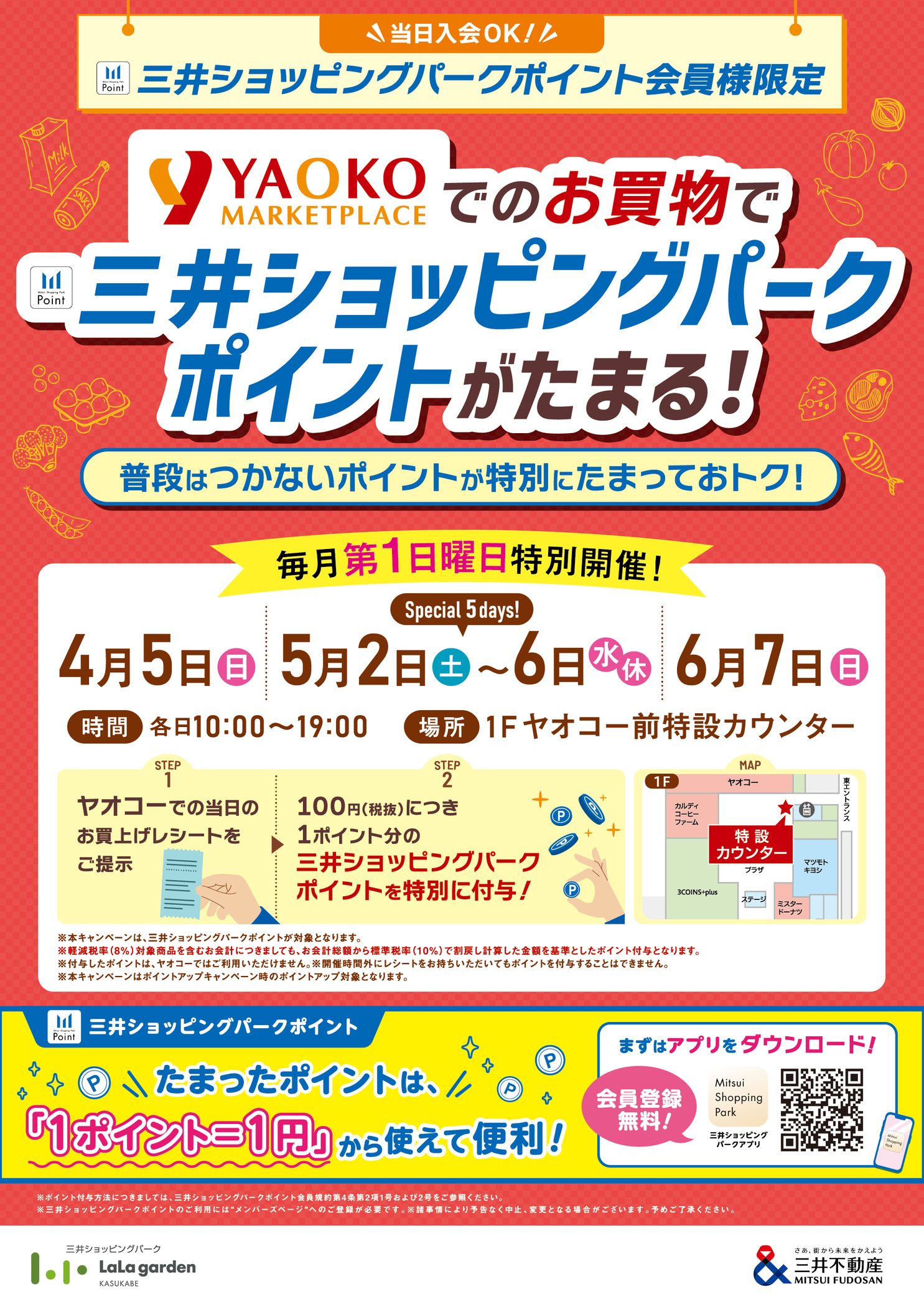 ヤオコーでの当日お買上げレシートを特設カウンターにご持参いただくと、100円(税抜)につき1ポイント分の三井ショッピングパークポイントを特別に付与いたします。