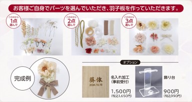 お客様ご自身でパーツを選んでいただき、羽子板を作っていただきます。