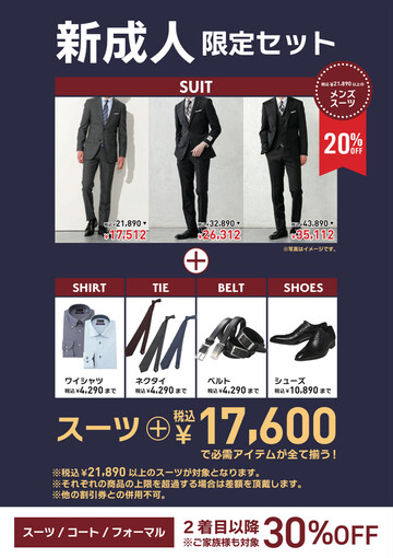 19,900円+税(税込21,890円)以上のスーツが20%OFF