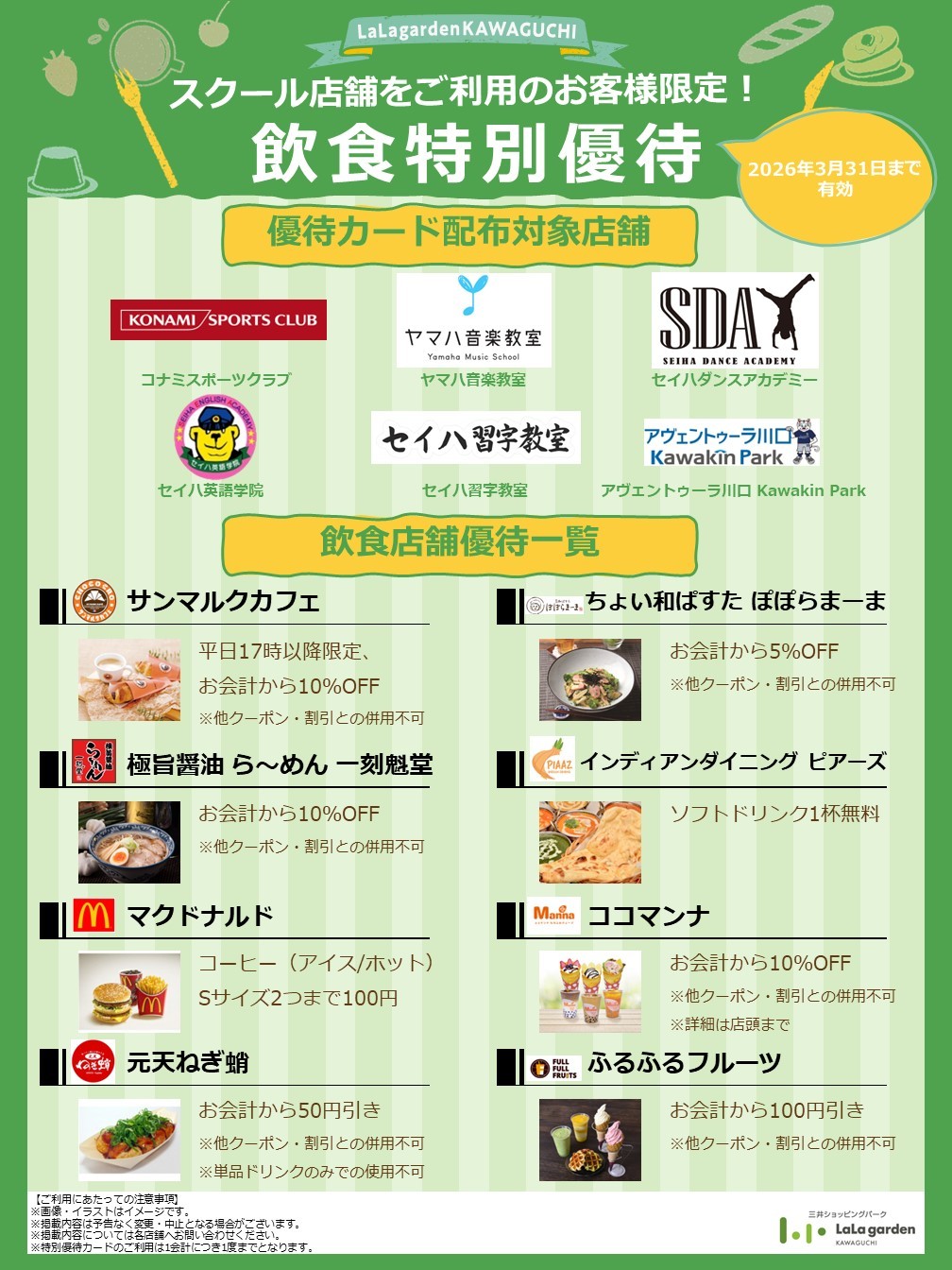 ララガーデン川口のサービス店舗をご利用のお客様限定で配布している「飲食特別優待カード」を対象店舗にてご提示で、うれしい特典が受けられます!