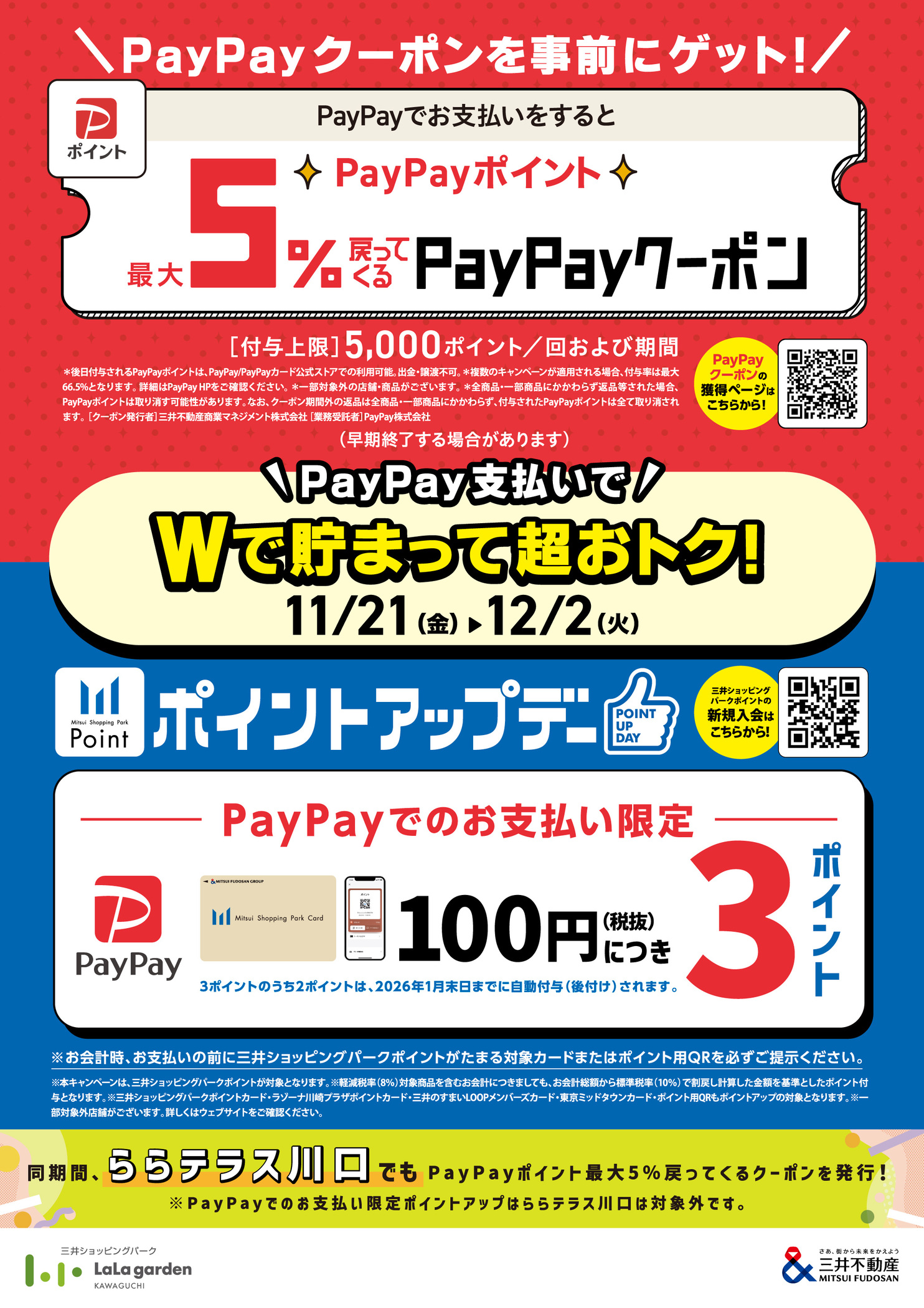 - PayPayポイント最大5%戻ってくるクーポン発行中!さらに三井ショッピングパークポイントもお得に貯まる!