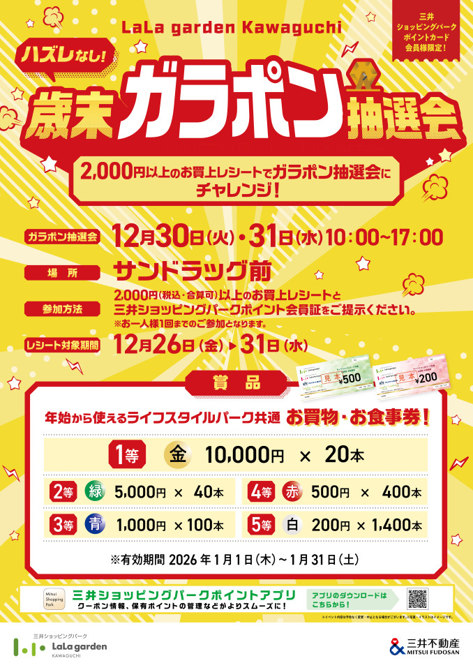参加方法:2,000円(税込・合算可)以上のお買上げレシートと三井ショッピングパークポイント会員証をご提示ください。