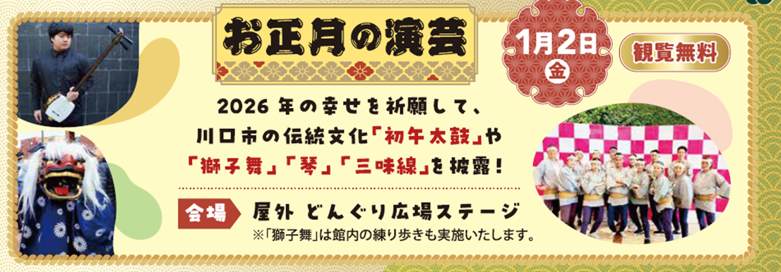 2026年の幸せを祈願して、川口市の伝統文化「初午太鼓」や「獅子舞」「琴」「三味線」を披露!