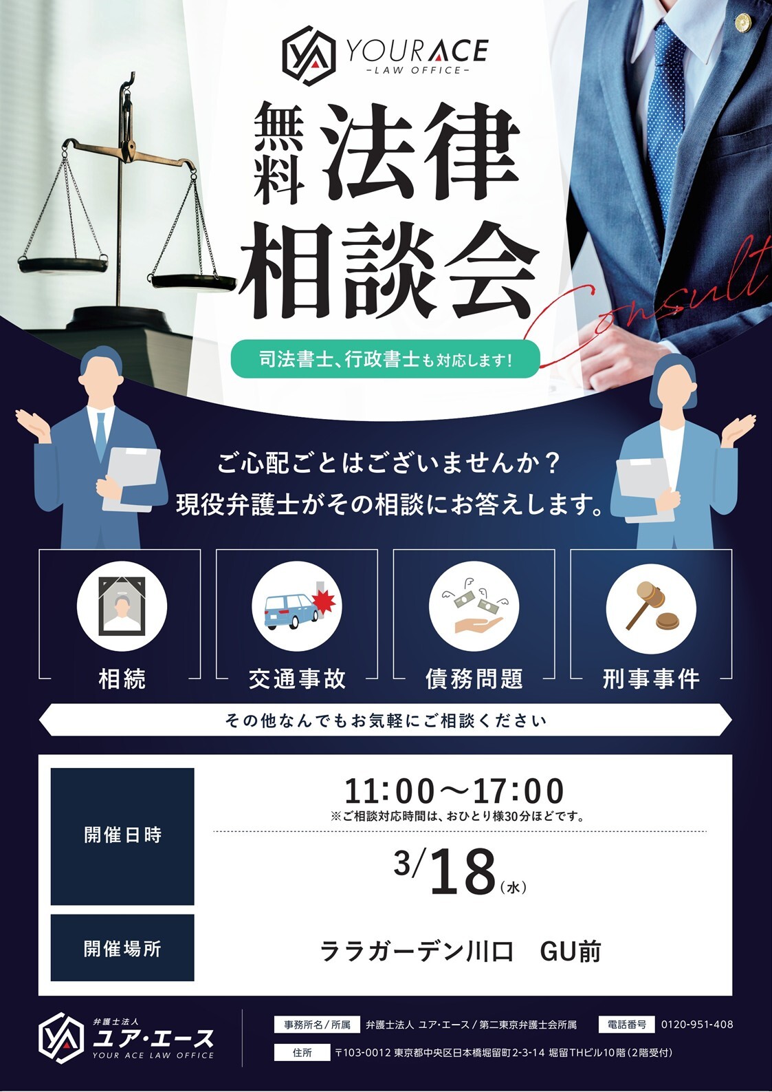 弁護士法人ユア・エースの弁護士、司法書士が、地域の皆さまのお悩み解決をお手伝いするために、無料法律相談会(約30分)を開催いたします!