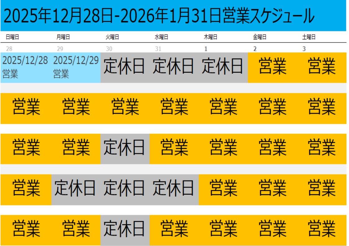 年末年始の営業ですが年内は12月29日が最終営業日となり年始は1/2日から予定しております。
