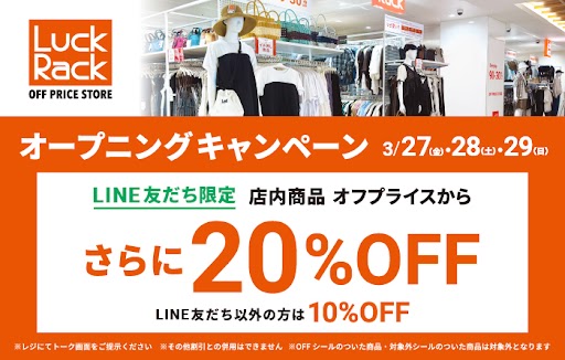 オープンを記念してLINE友だち限定、店内商品のオフプライスからさらに20%OFF!