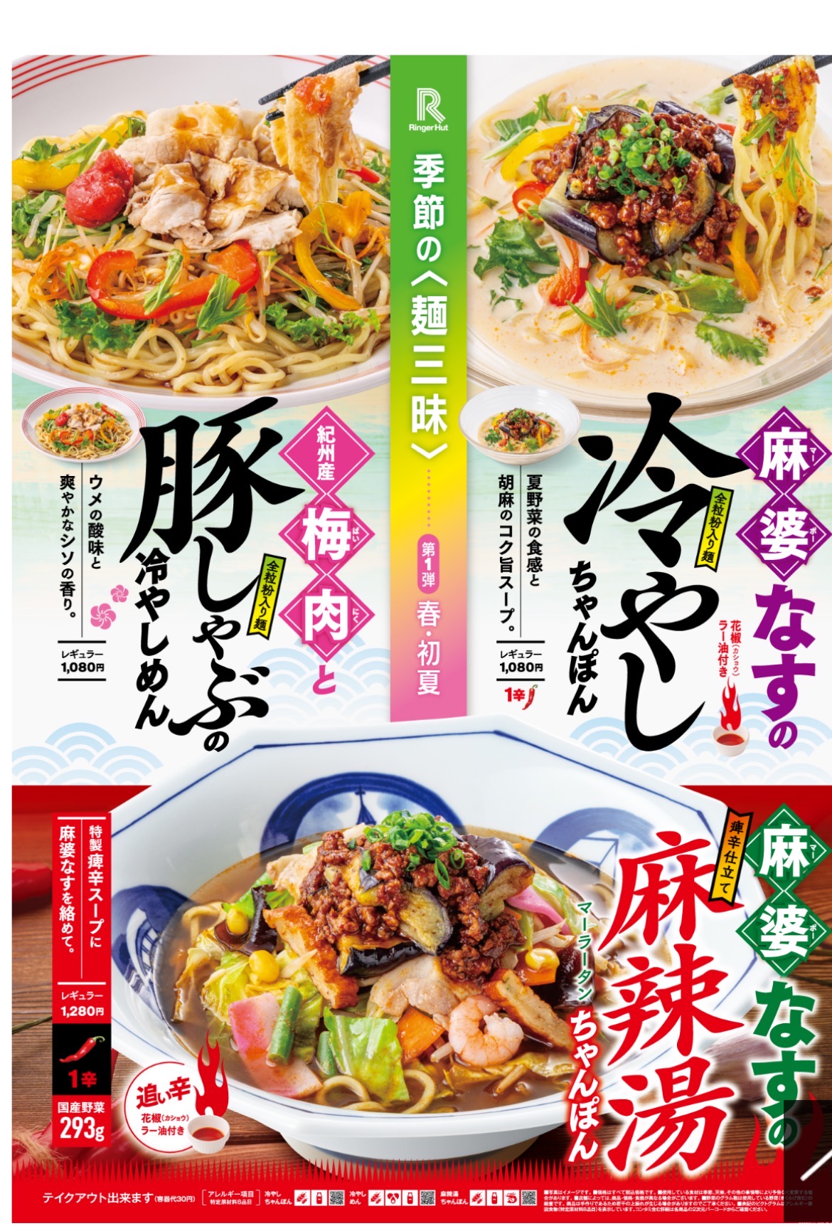 麻婆なすの冷やしちゃんぽん、梅肉と豚しゃぶの冷やしめん、麻婆なすの麻辣湯ちゃんぽん三種類の麺が登場しました。是非お試しください。