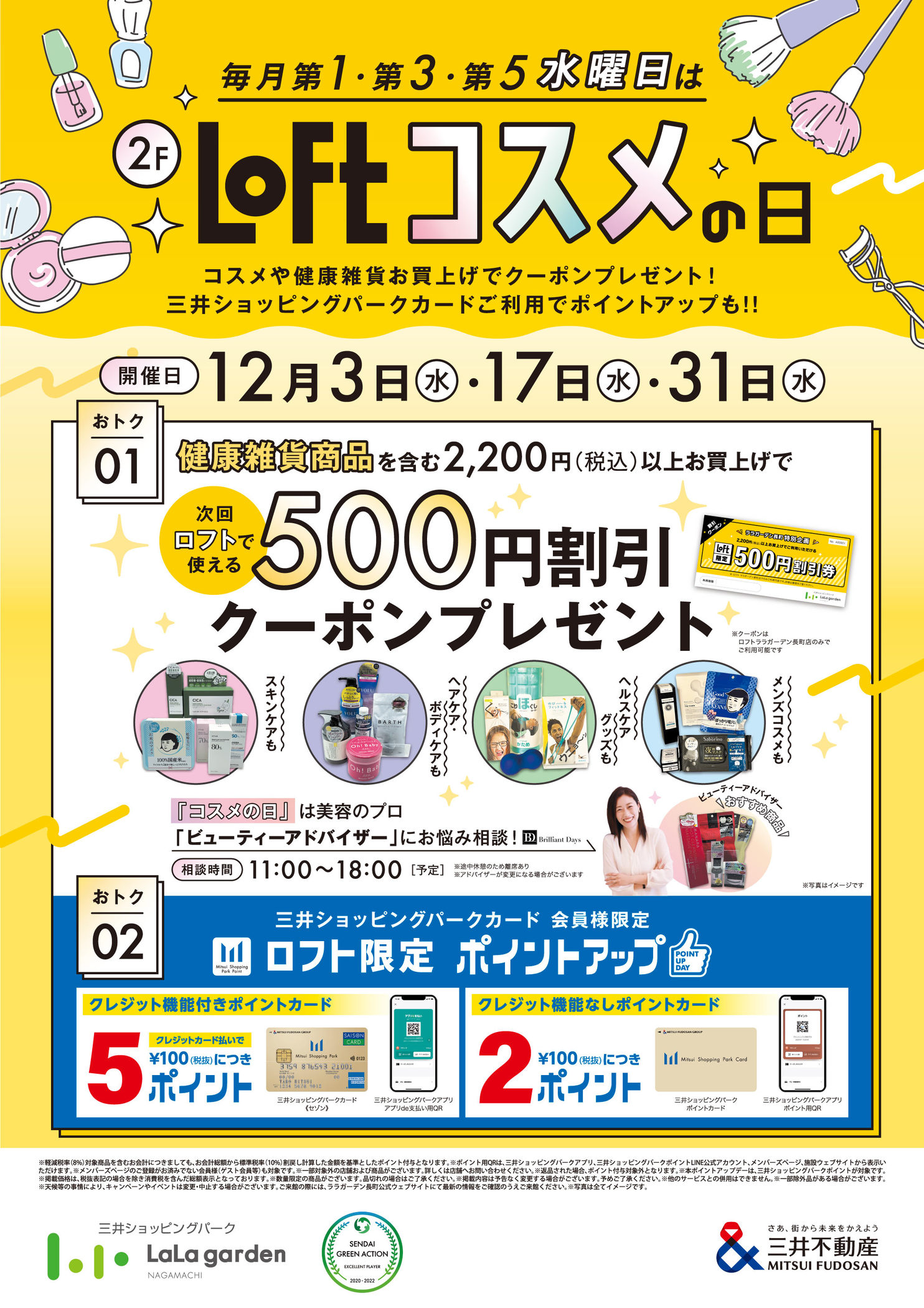 毎月 第1・第3・第5水曜日は2Fロフトでコスメや健康雑貨を2,200円(税込)以上お買上げいただくと、次回使える500円クーポンをプレゼント!