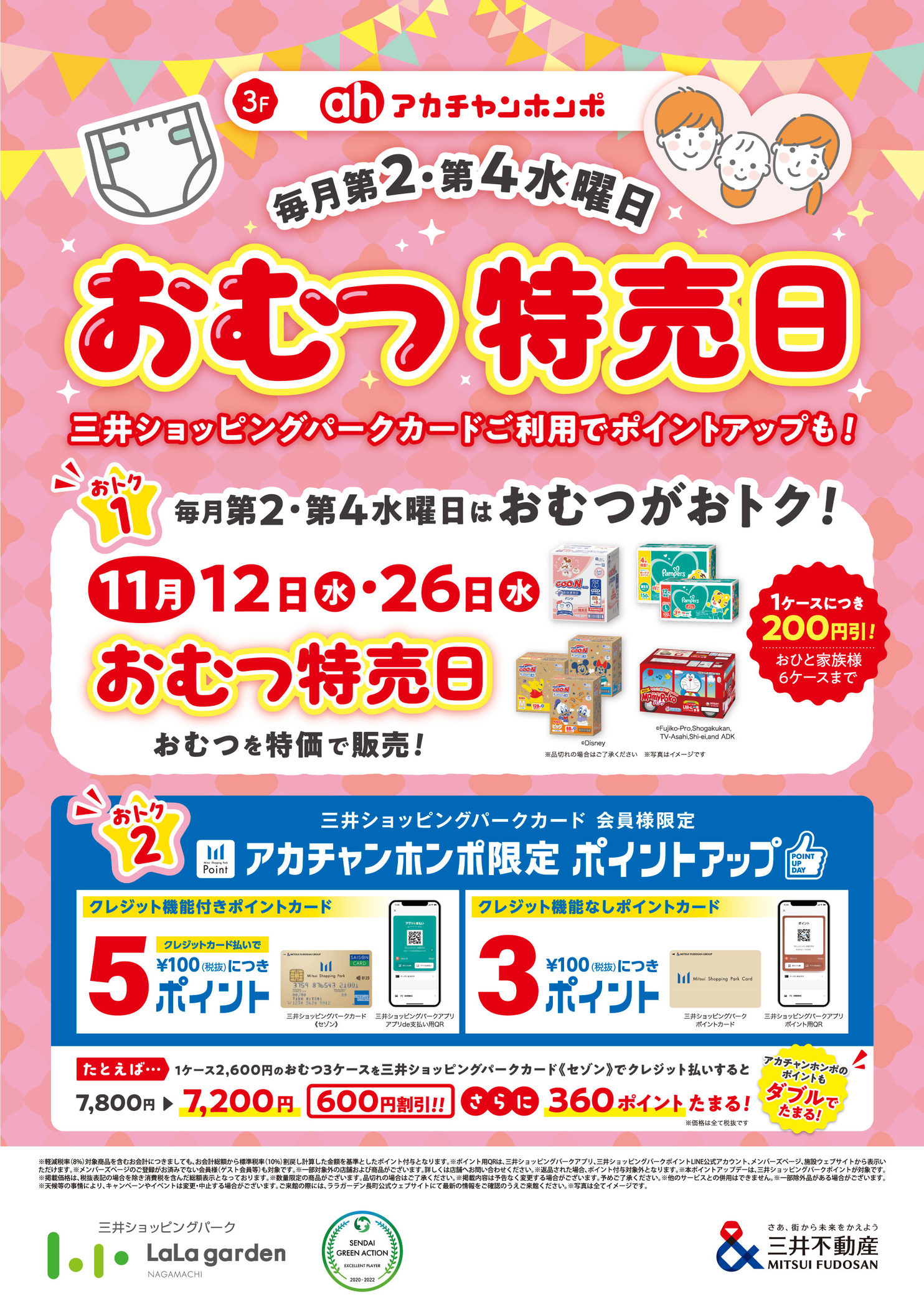 毎月第2・第4水曜日は3Fアカチャンホンポでおむつがお得になる「おむつ特売日」。