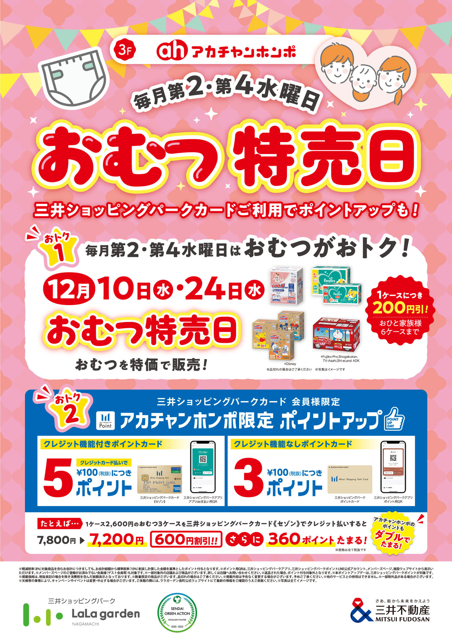 毎月第2・第4水曜日は3Fアカチャンホンポでおむつがお得になる「おむつ特売日」。