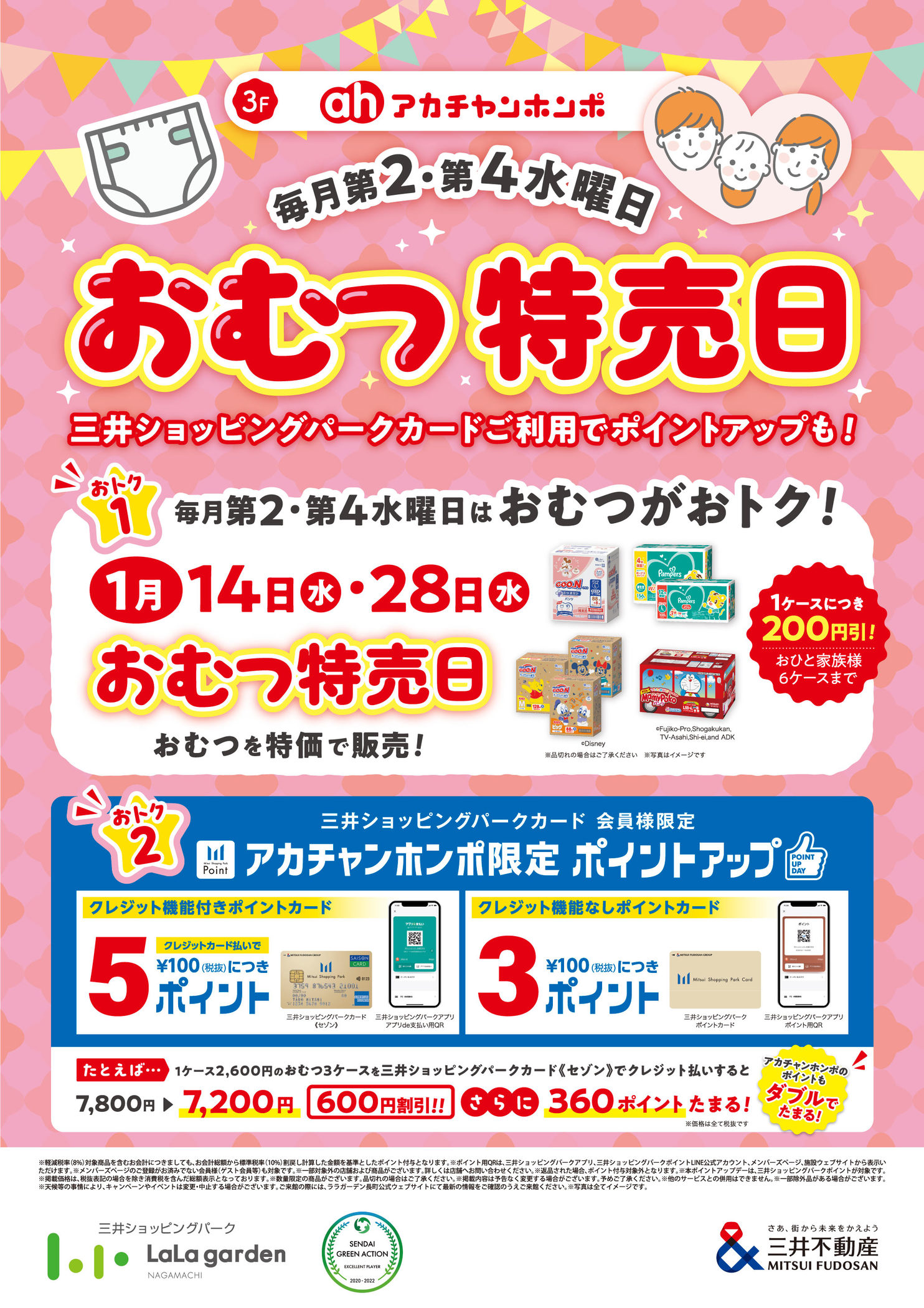 毎月第2・第4水曜日は3Fアカチャンホンポでおむつがお得になる「おむつ特売日」。