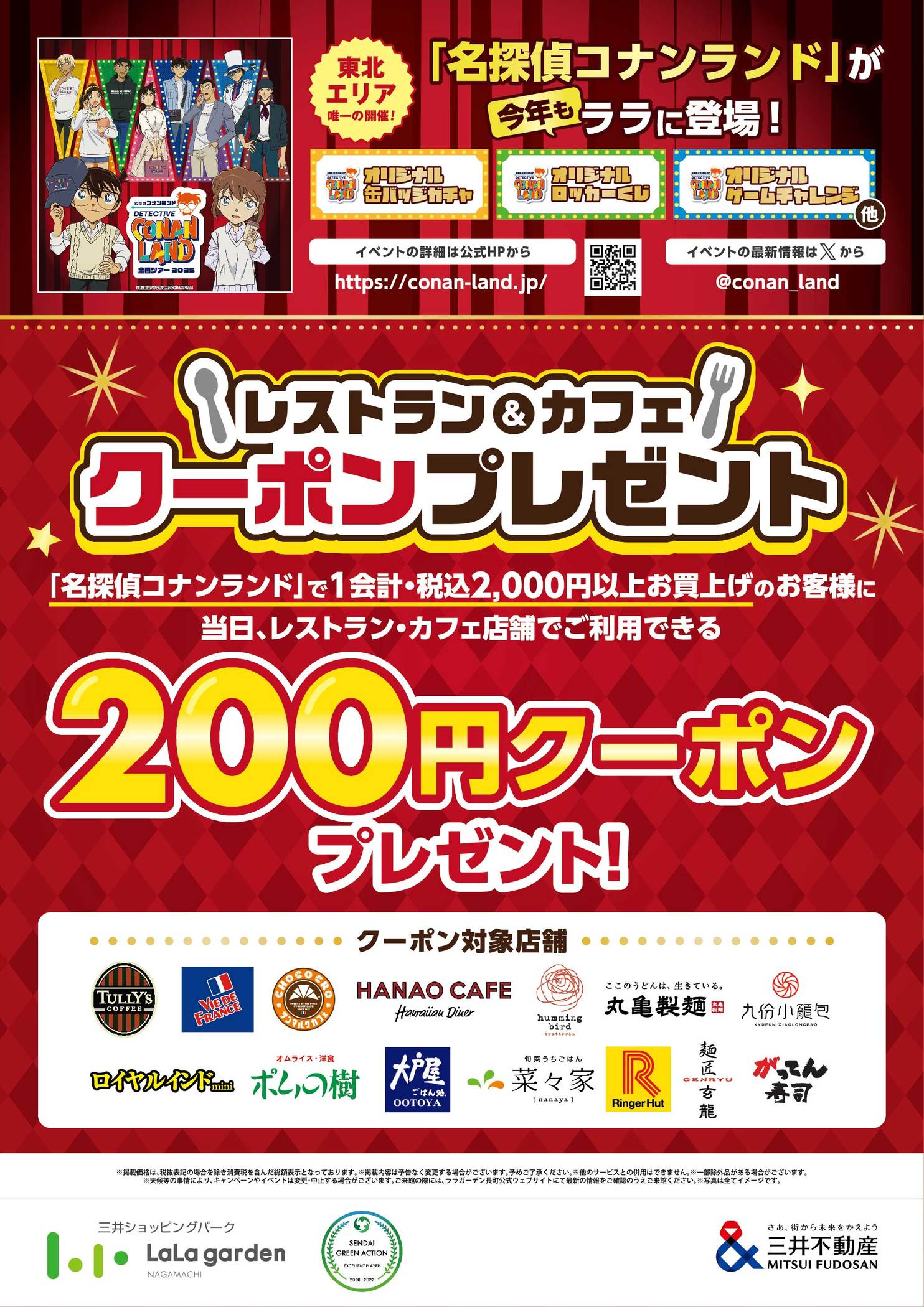 「名探偵コナンランド」で1会計・税込2,000円以上お買い上げのお客様に、レストラン・カフェ店舗でご利用できる200円クーポンをプレゼント!<有効期限:12/28(日)>